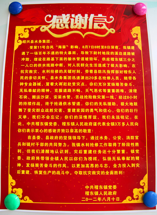 8月17日,中共稽東鎮黨委、稽東鎮人民政府專程為集團送來感謝信和錦旗,衷心感謝集團在第11號臺風“海葵”期間,發揚艱苦奮斗、無私奉獻精神,第一時間成功搶修被毀壞的輸水總管,保障了該鎮人民群眾的飲水安全。