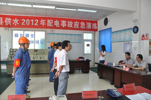 為全面深化安全生產月活動,提高部門職工對突發(fā)事故的分析與應急處理能力,確保全縣供水系統(tǒng)安全可靠的運行,6月29日,公司在鳳凰山泵站舉行2012年配電反事故應急演練。